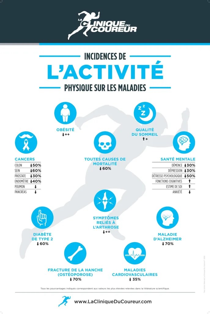 –Réduction de l’obésité et des risques de mortalité précoce. –Diminution des risques de cancer, de diabète, d’ostéoporose, d’arthrose et de maladie cardio-vasculaire. – Prévention des maladies neurodégénératives, comme Alzheimer. – Amélioration de la santé mentale, avec une diminution de la dépression et de l’anxiété, une meilleure qualité de sommeil. – Développement des fonctions cognitives et de l’estime de soi, renforcement musculaire, amélioration de l’endurance, des capacités pulmonaires, de l’équilibre et de la coordination.